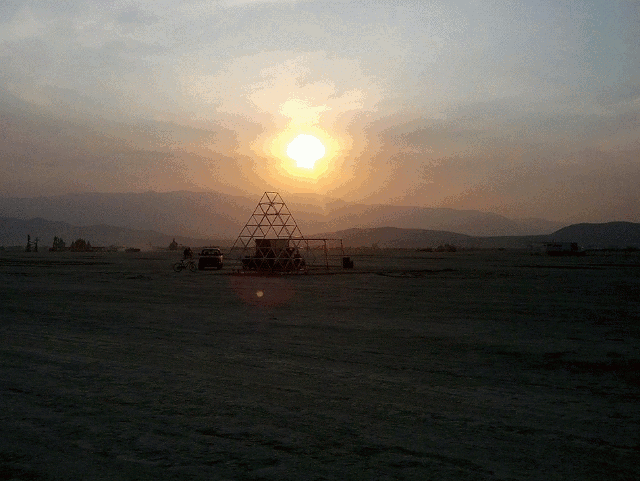 One only needed to stand about 100' away to remove enough parallax for the illusion to work. Here's a handful of shots as one approaches at sunset.