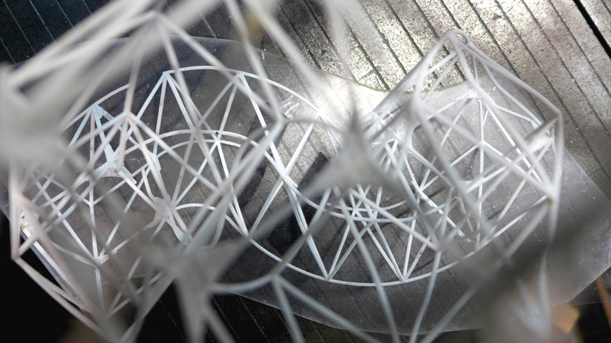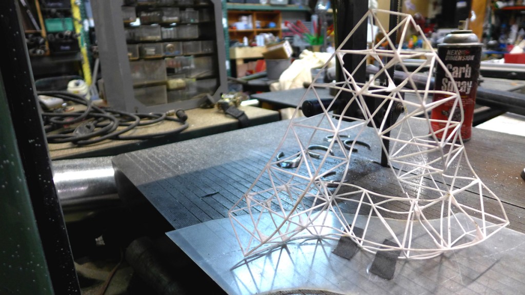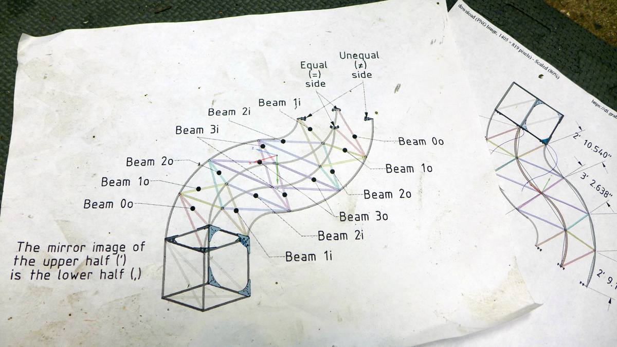 So there you have it. The project has reached an important milestone but there is still a lot of work to do. The smooth shape and solid renderings make it easy to forget that it takes a lot of little details and printouts (2D and 3D!) to go from a model to a standing structure. A print out on the floor of the shop laying out beam members: