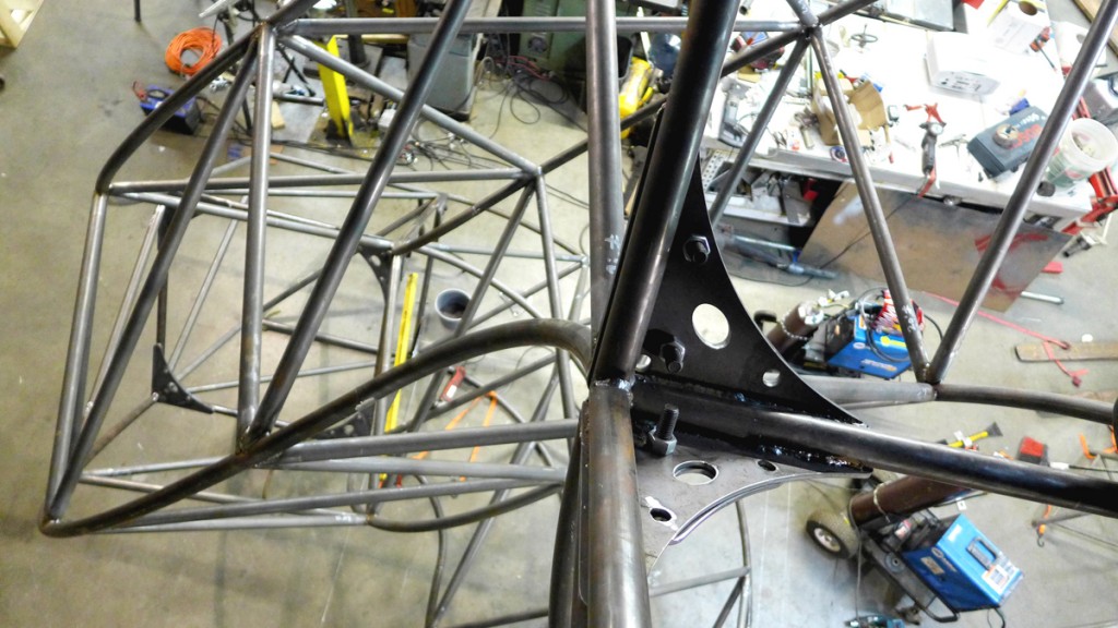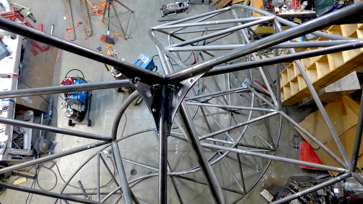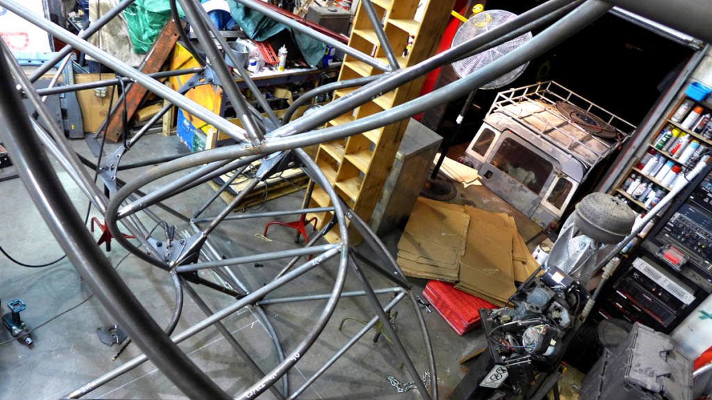 The third arm is in place and the structure has been assembled for the first time. It is now a (nearly) freestanding object. You'll note the stands holding the base of the cubes in this shot. The floor of the shop is not perfect so it still requires some custom stands to secure it while it's being worked on and actually CLIMBED!