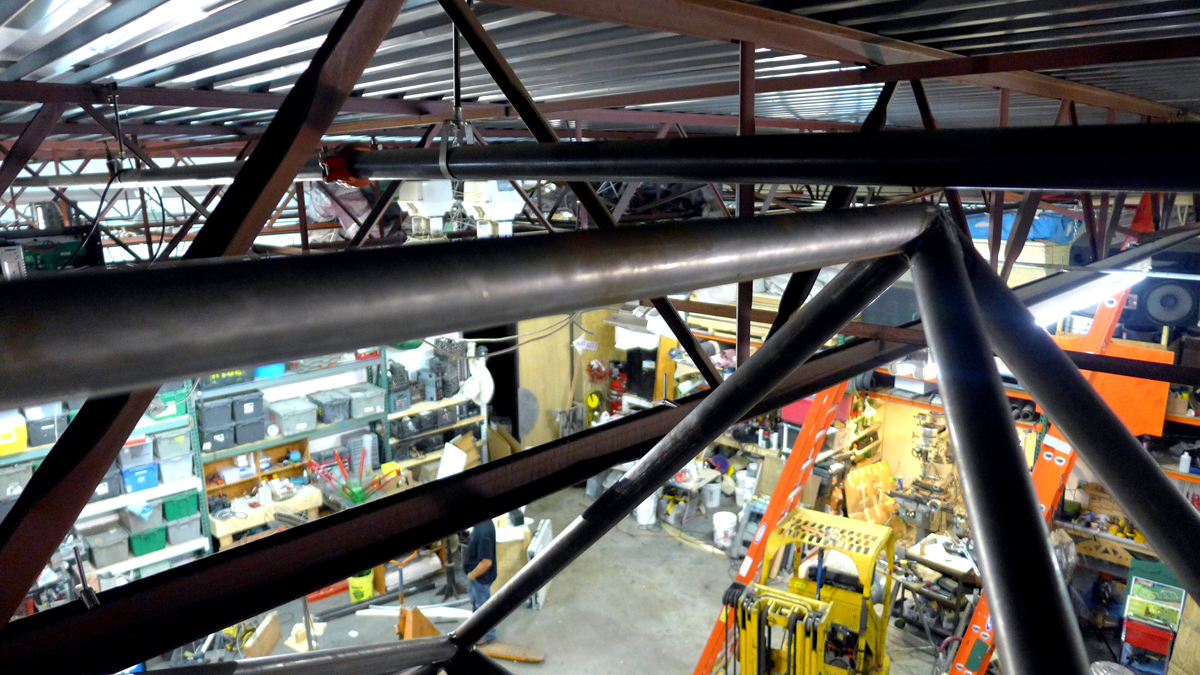 As a side note, the precision of Penrose Triangle's construction is evident all around at every weld and every beam's curve. That said, nowhere did it come into such focus for me as it did in seeing how close the very top of it is from the ceiling of the shop. That is a tight fit!