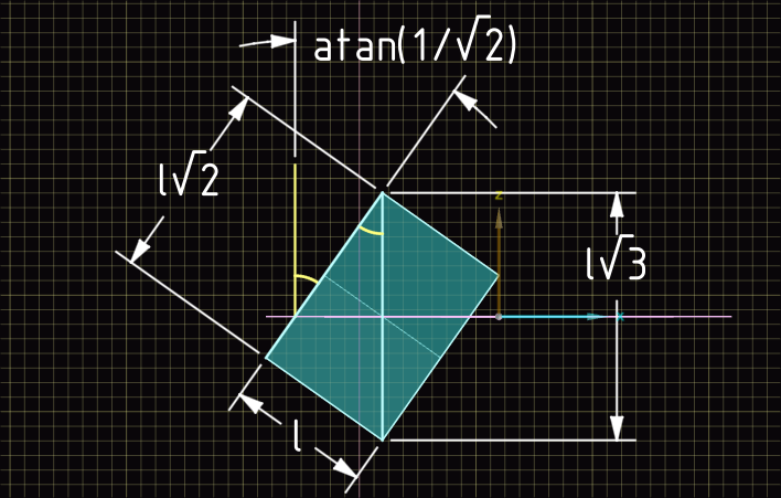 Three of those side faces on the hexagonal prism will tilt one way, and the other three will tilt the other, all rotating along their cross section lines, to form the cube. What's the correct angle? Here's the cube in a delightful cross with a right triangle with the edge length (l), the length of the face diagonal, and the length of the cube diagonal.