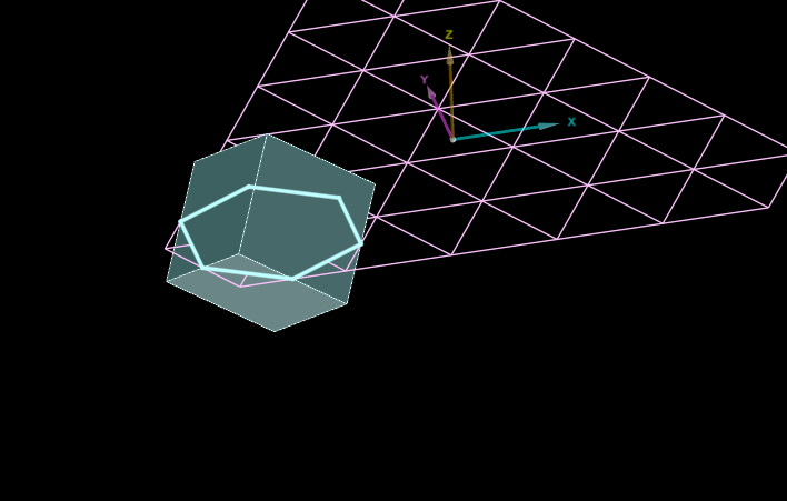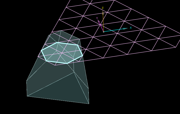 The first step is to create properly-oriented corner cubes from their hexagonal silhouettes. Let's draw it's cross section, which is the hexagon inscribed on the midpoints of the edges of the silhouette.