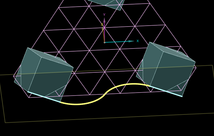 We know the start and end points of the arm beams, so we really just need to agree on an interpolation technique. Linear and spline interpolation are fast and easy, but observe that introducing arcs leads to an elegant solution. There is exactly one pair of tangent arcs that are tangent to both cubes for the bottom-most beam. This pair of arcs is symmetric, which matches the needed symmetry.