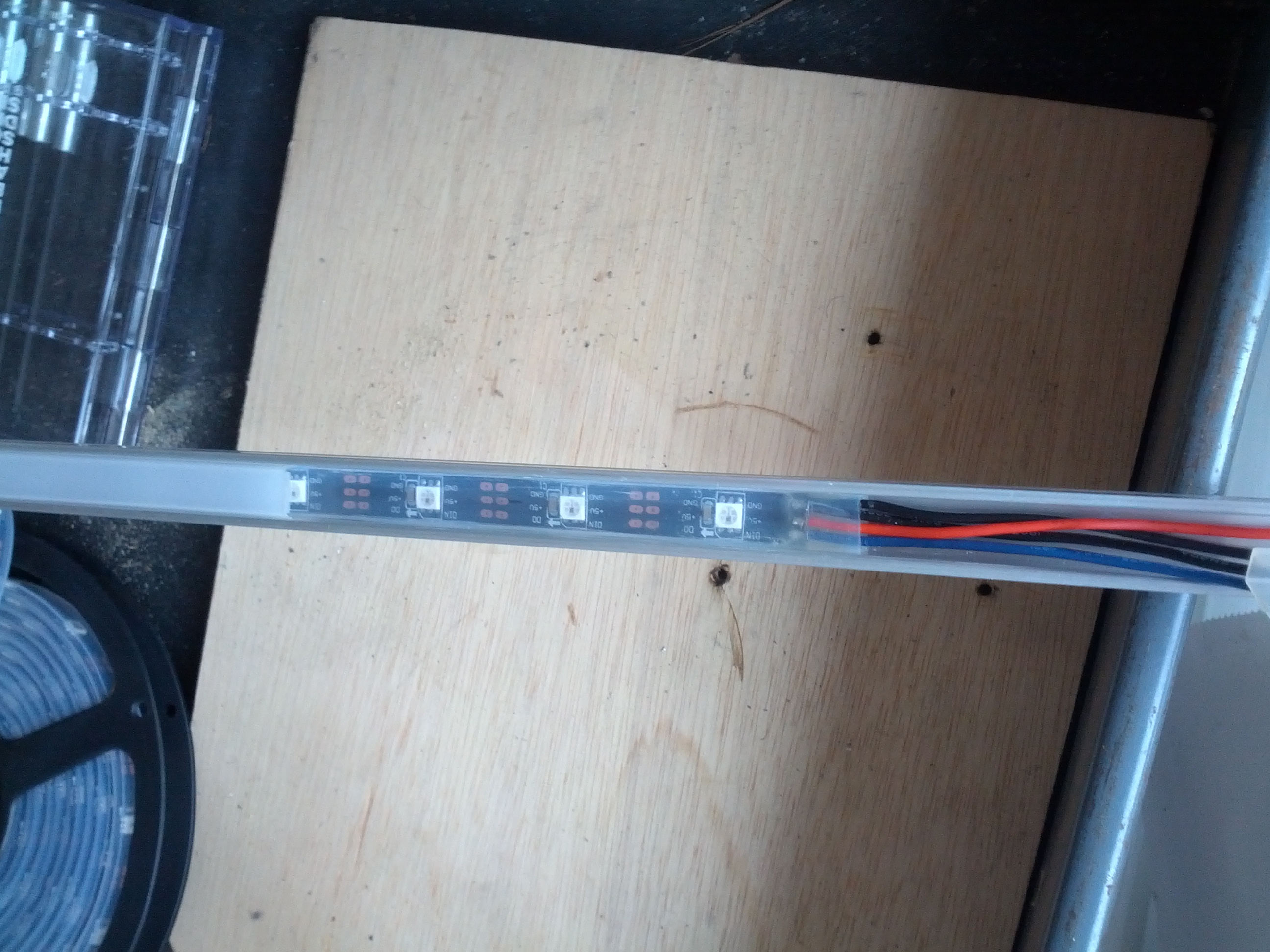 Here is what our LED strips, with 30 individually addressable LEDs per meter, will look like in the fancy channel with a diffuser. (Actually the strips we are using are white).