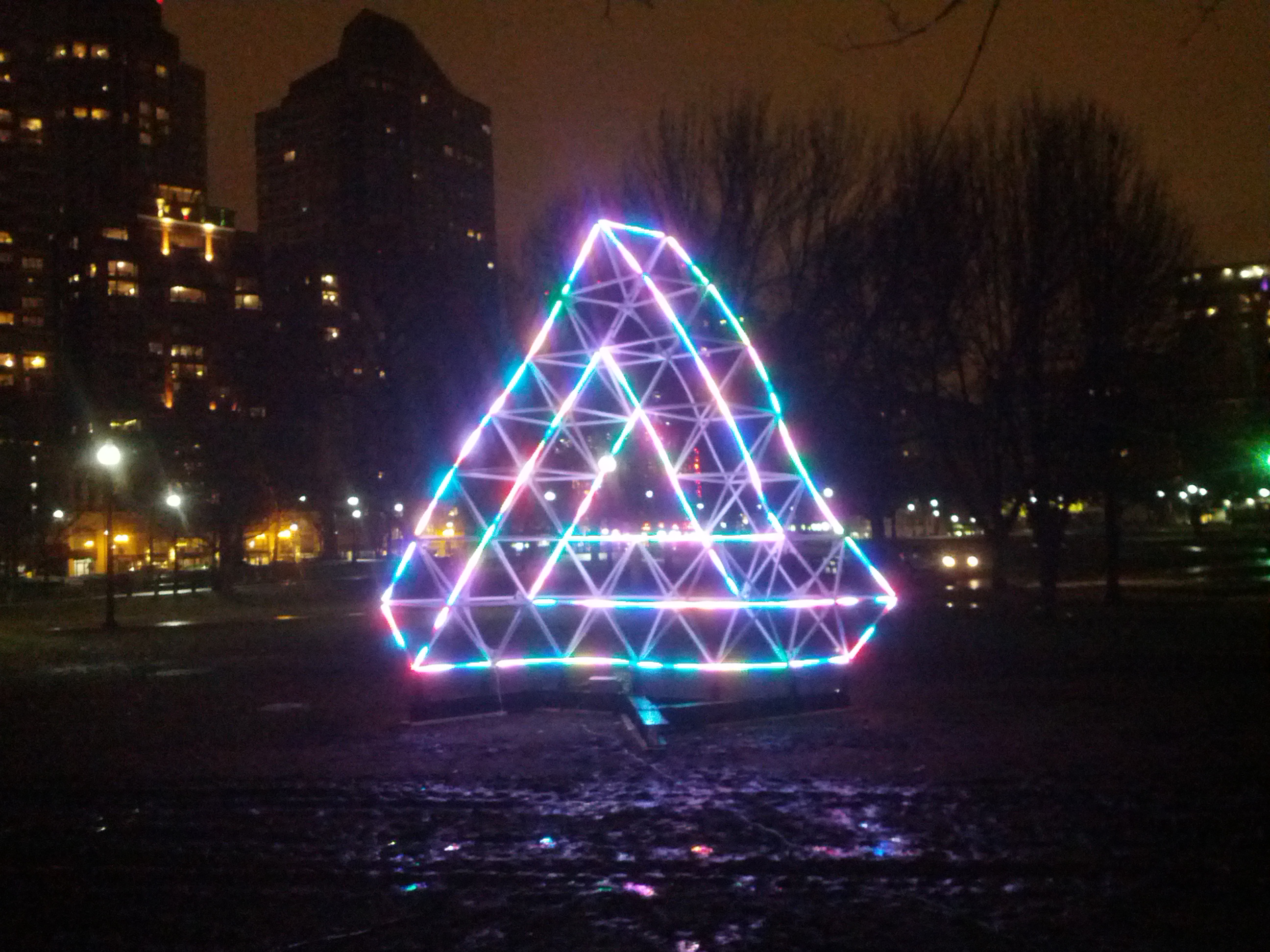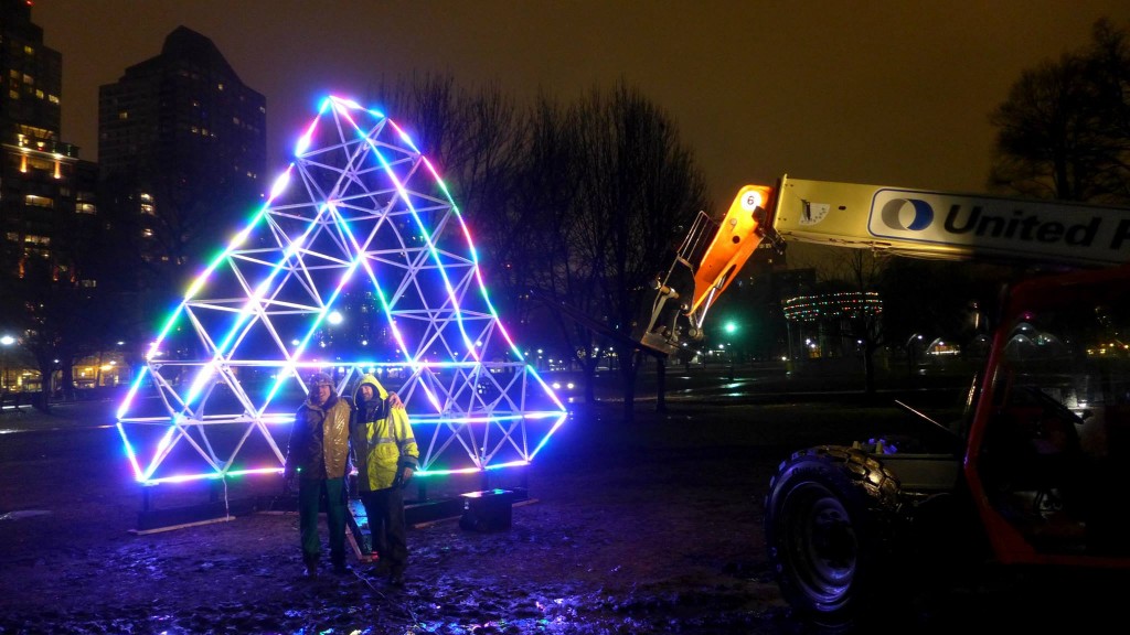 One of the exciting parts of a Burning Man project is the challenge of installing the work in the middle of a desert. This evening, we learned first hand that Boston offers just as exciting challenges. Surly, Jacob, John Dill, Ronny, and I each spent a few hours today in 37°F heavy rain, fumbling with bolts (and it Ronny's case climbing). Now, I am delighted to say that thing is sitting in Boston Common!
