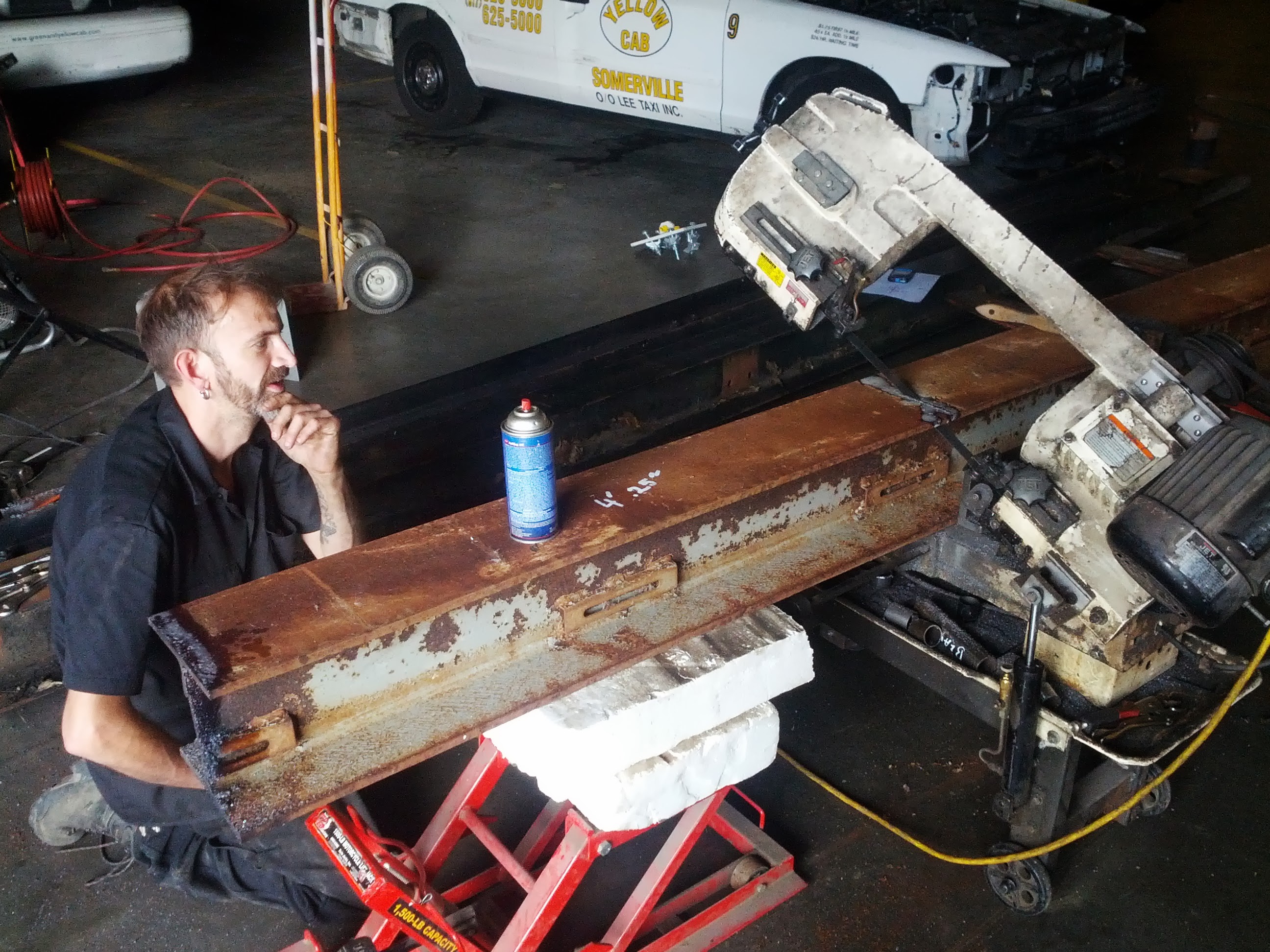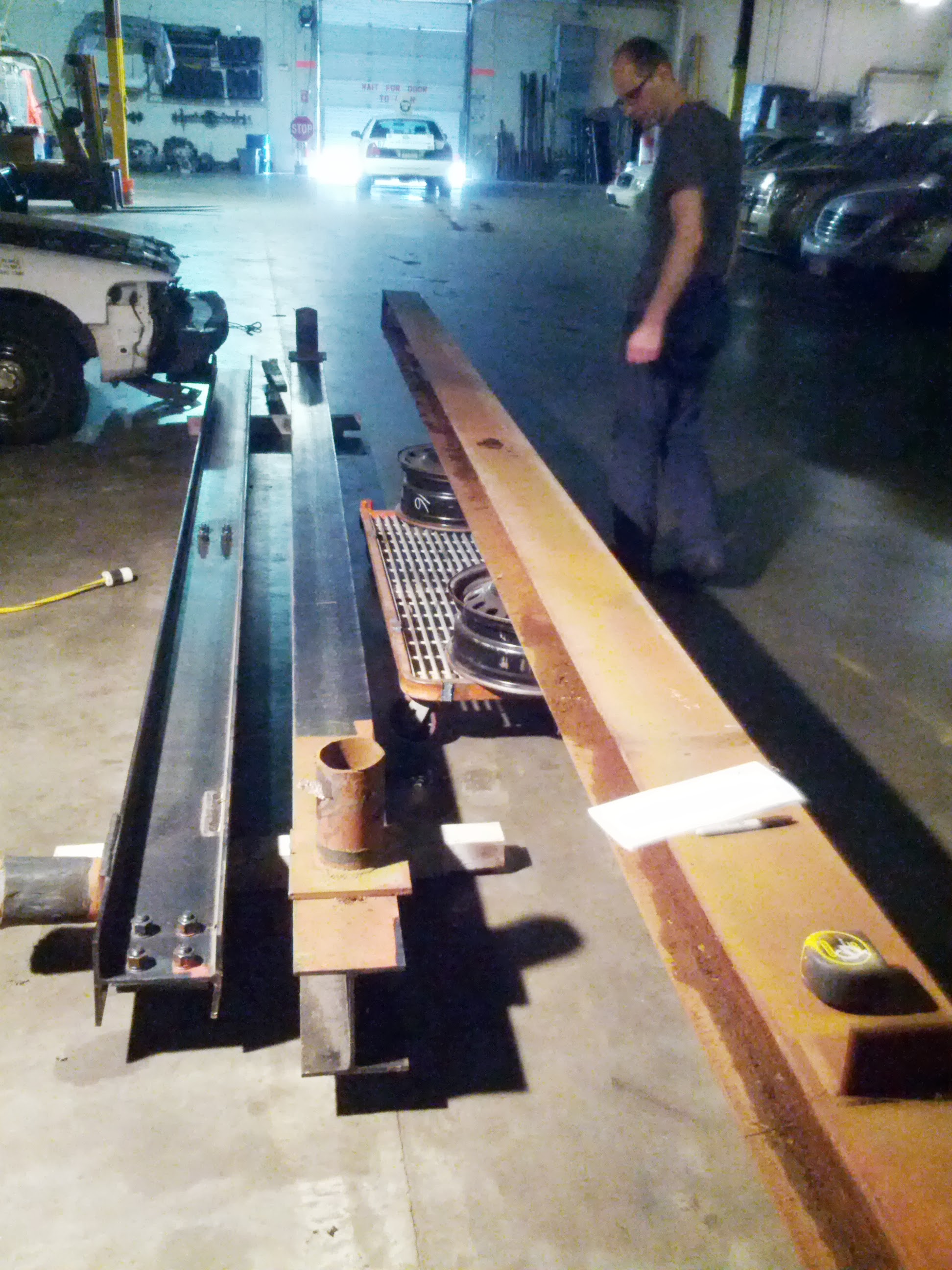 Yesterday, a flatbed arrived with some I-beams for our base. Although the upper part of the design needed to be made from new materials, we wanted to reclaim materials for the base. Fortunately, the junkyard around the corner had a few old pieces of I-93 we could use. They were a little heavier than anticipated, but we are buying them at scrap rates, and we can sell them back if we ever get this thing permanently installed someplace. Here, Leonid inspects the delivery with glee.