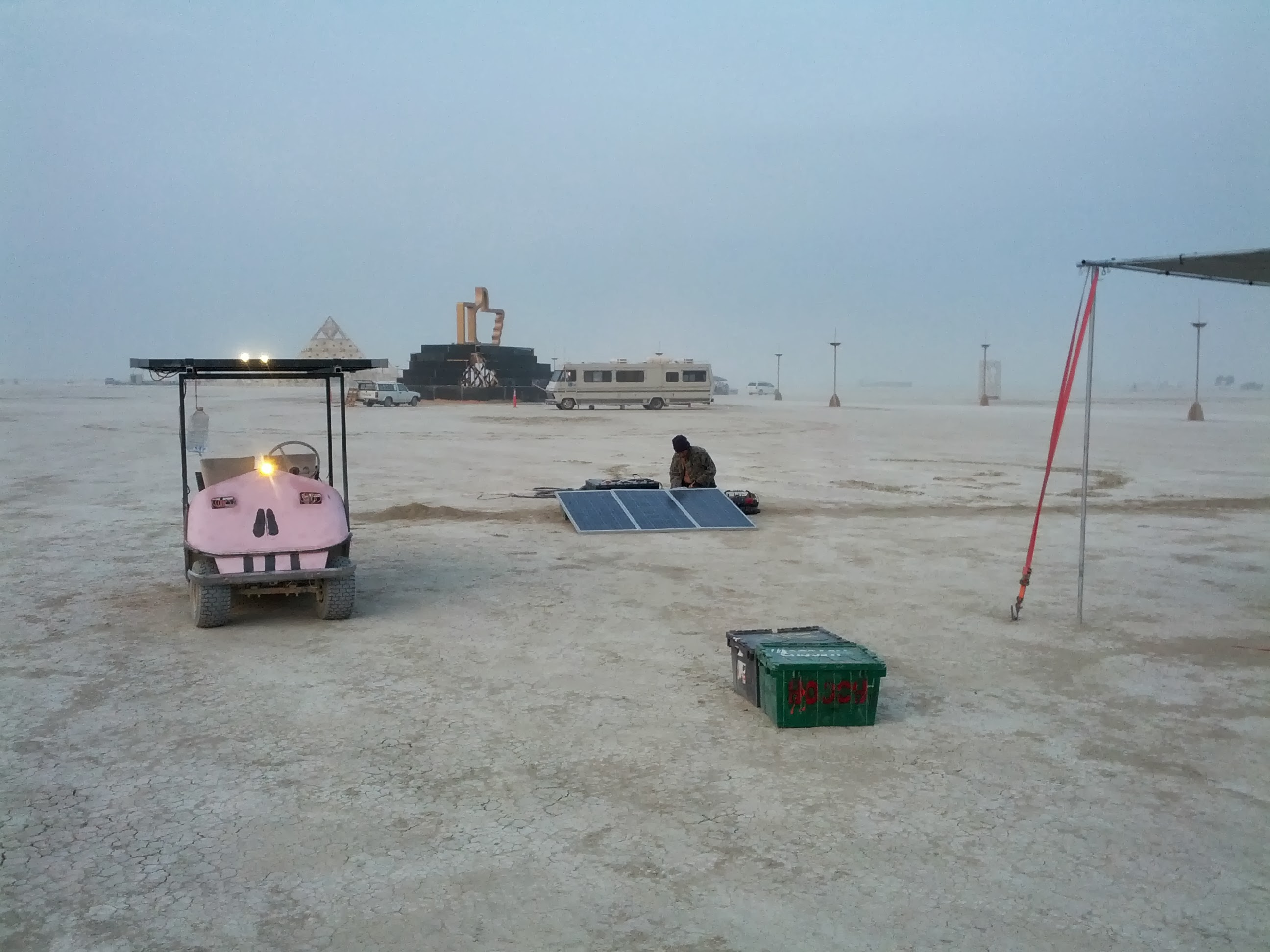 We had a little problem with our solar supply chain at the last minute, which meant we might have to cart our batteries all over the playa to charge them or deploy a smelly, noisy generator. Thanks to the excellent networking skills of Terry Dovidio, Snow Koan Solar came to our rescue, supplying us with these handsome panels and a charge controller.