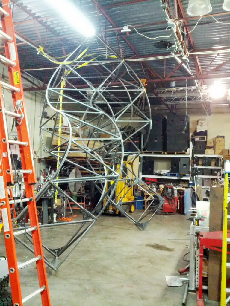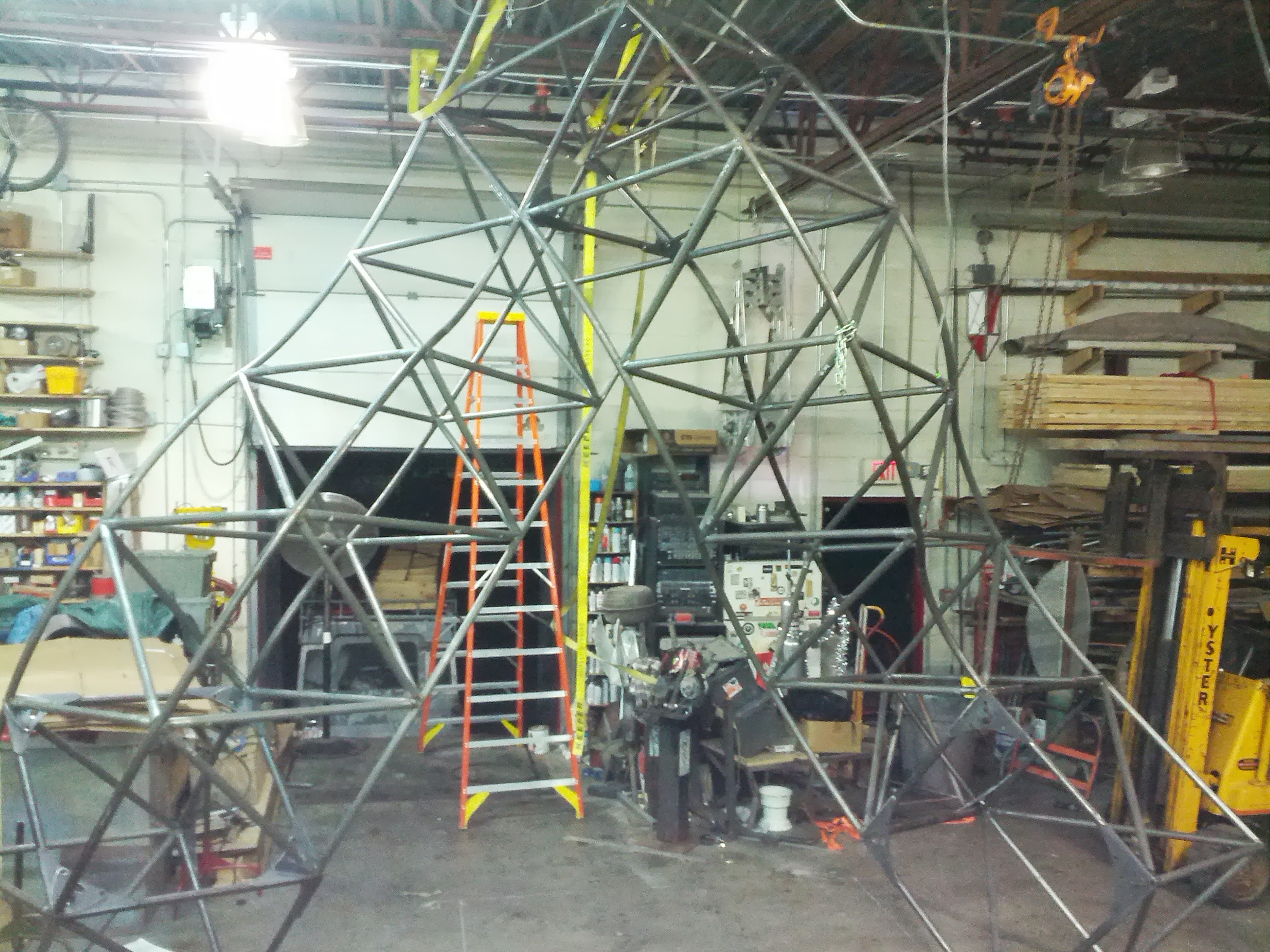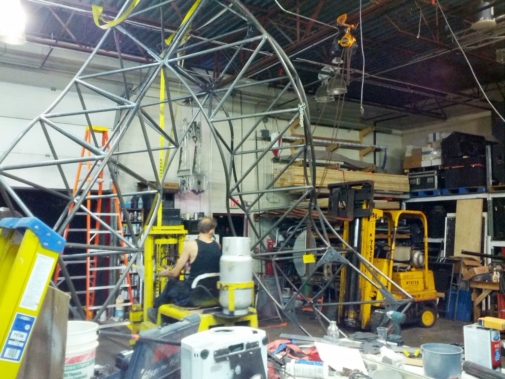 Keep in mind I designed the thing to be just a few inches short of Surly's ceiling. I mean, we wanted to make it as big as we could. That ceiling seemed really far up there. Pretty cool that Surly can drive a forklift under it, though. Actually, I have now seen a new kind of forklift art that will keep me up a night for weeks.